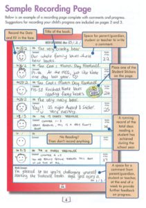 • How long they read for, the number of pages read OR an optional response to the book, e.g. “I liked this book because…”
